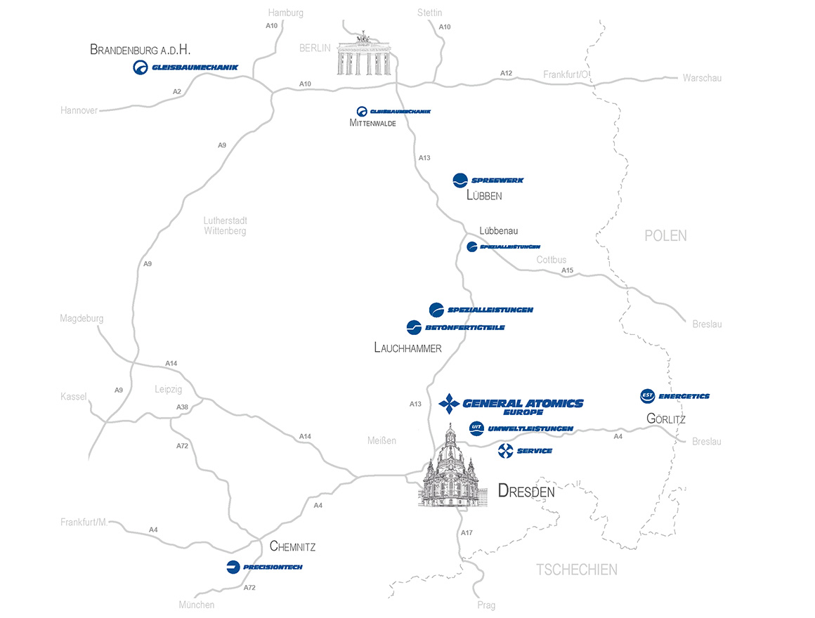 GBM Gleisbaumechanik Brandenburg/H. GmbH GBM Gleisbaumechanik Brandenburg/H. GmbH Spreewerk Lübben GmbH SGL Spezial- und Bergbau-Servicegesellschaft Lauchhammer mbH SGL Spezial- und Bergbau-Servicegesellschaft Lauchhammer mbH B+F Beton- und Fertigteilgesellschaft mbH Lauchhammer General Atomics Europe EST Energetics GmbH Umwelt- und Ingenieurtechnik GmbH Dresden General Atomics Services Germany GmbH